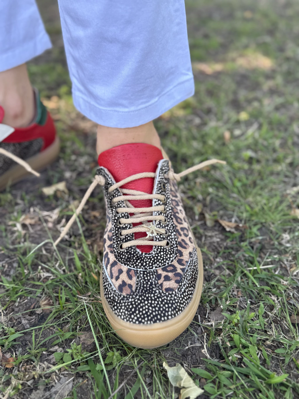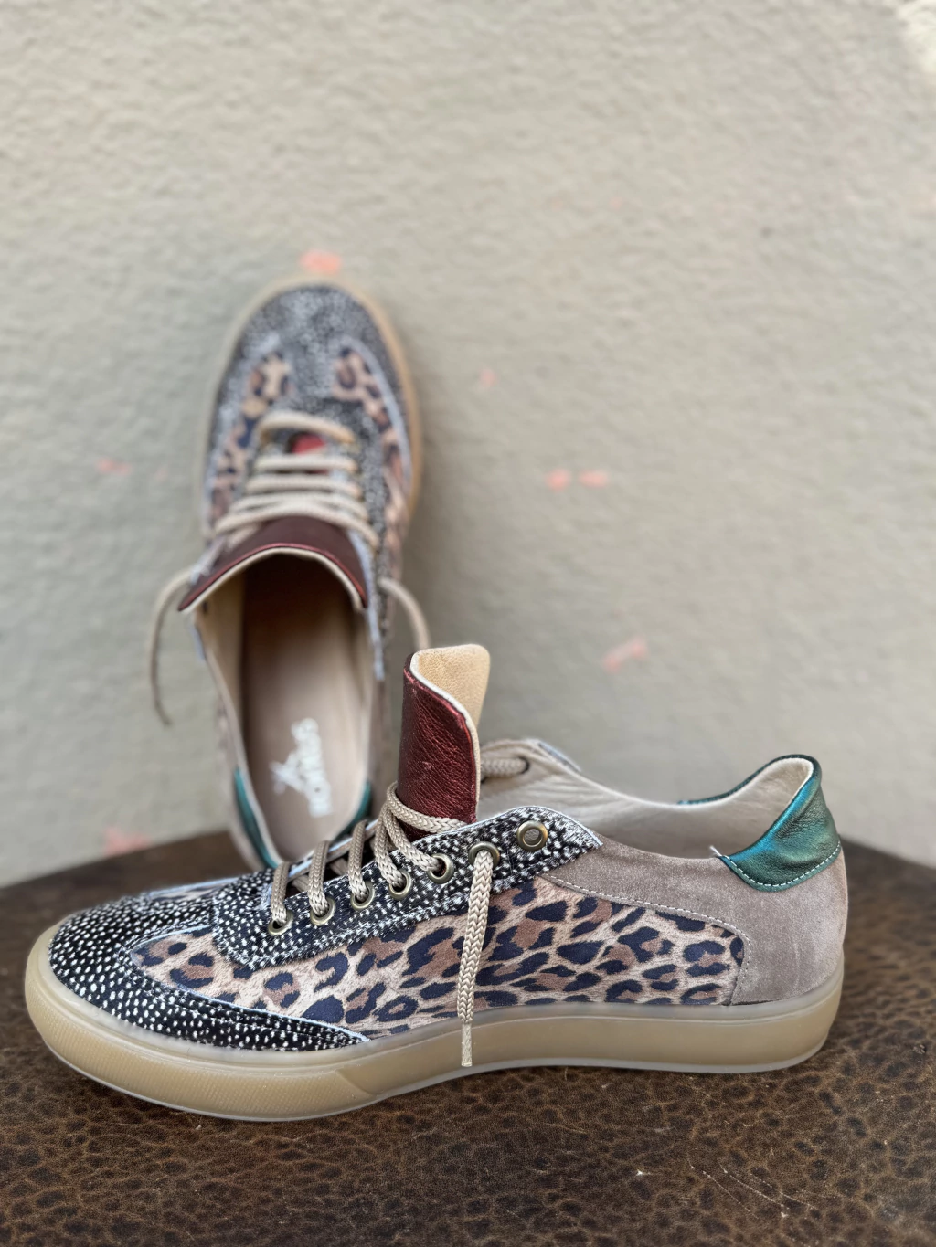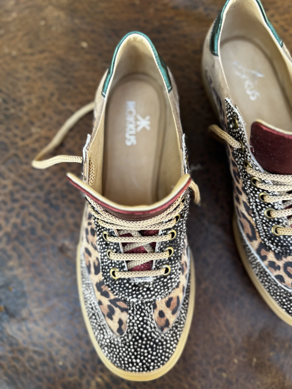 Cada par combina: cuero natural + gamuza + cuero con pelo + cuero estampado . animal print (pintitas, leopardo, todo mezclado como nos gusta) que remiten al instinto del halcón cazando. talones en colores poderosos (rojo, verde metalizado) como acentos de velocidad. lengüetas XL , pin de bronce, el sol, sello ROKKUS, que le dan identidad y presencia. suela traslúcida estilo vintage–sport, firme pero elegante. Son todas distintas — pero una misma especie: zapatillas hechas por artesanos del calzado. Un ítem que no existía en el polo hasta ahora: un statement visual. La demora de entrega es de 20 dias.